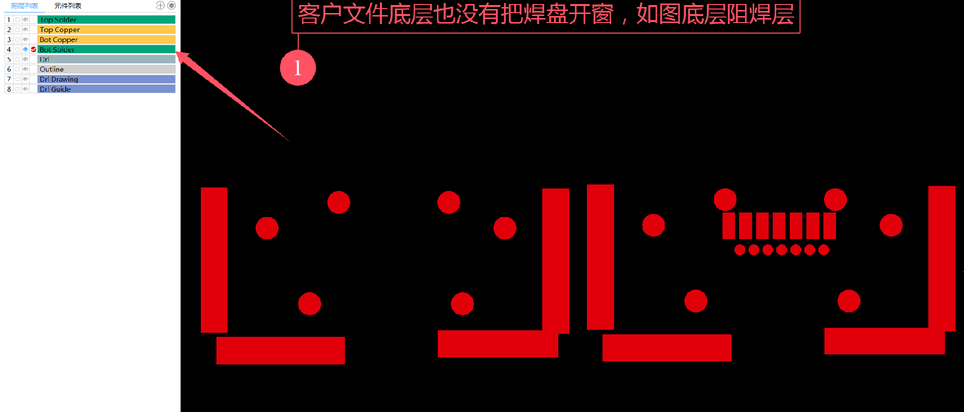 文件明顯的出現了錯誤,錯誤原因是阻焊層是蓋油的最終成品按文件應該是